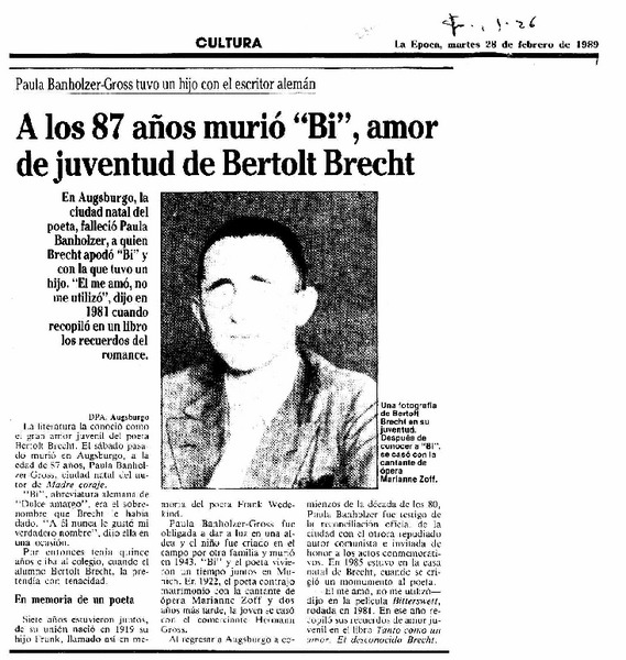 A los 87 años murió "Bi", amor de juventud de Bertolt Brech. [artículo]