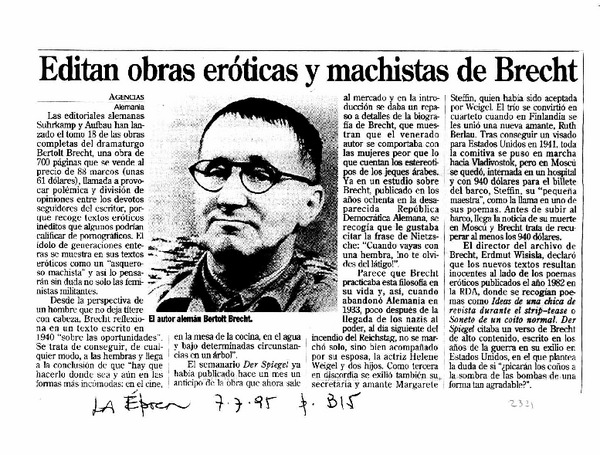 Editan obras eróticas y machistas de Brecht. [artículo]