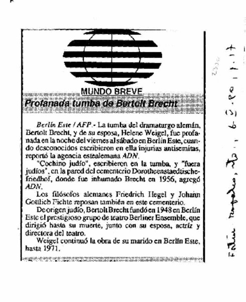 Profanada tumba de Bertolt Brecht. [artículo]