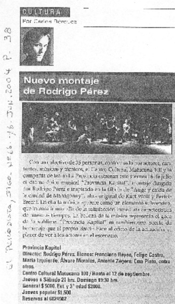 Nuevo montaje de Rodrigo Pérez [artículo] Carlos Bórquez.