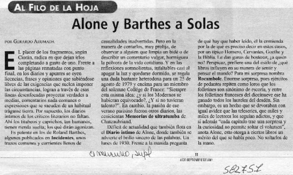 Alone y Barthes a solas [artículo] Gerardo Ahumada.