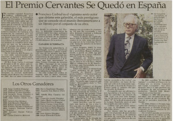 Paco Umbral recibió el Premio Cervantes. [artículo]