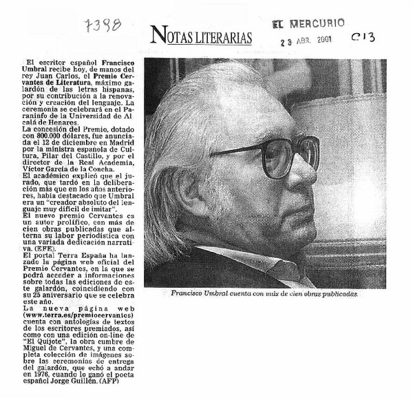 Español Francisco Umbral el Cervantes 2000. [artículo]