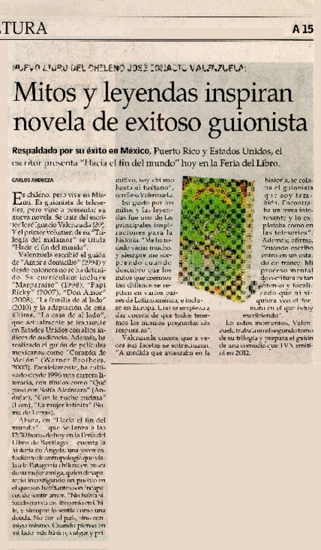 Mitos y leyendas inspiran novela de exitoso guionista [artículo] Carlos Andueza.