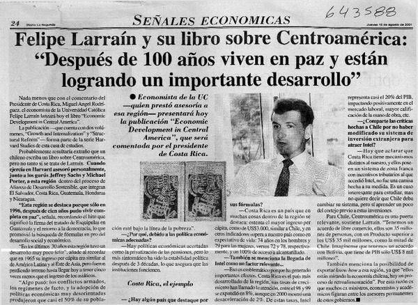Felipe Larraín y su libro sobre Centroamérica, "Despues de 100 años viven en paz y están logrando un importante desarrollo" [artículo]
