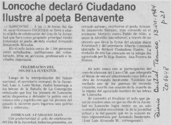 Loncoche declaró ciudadano ilustre al poeta Benavente [artículo].