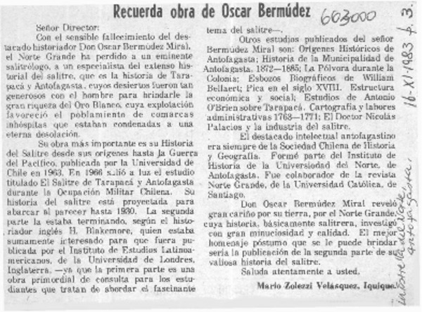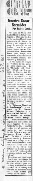 "Con Oscar Bermúdez desaparece uno de los pioneros de la historia del norte grande" [artículo] Domingo Gómez.