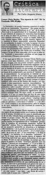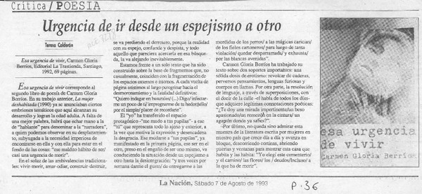 Carmen Gloria Berríos, "Esa urgencia de vivir" [artículo] Carlos Jorquera Alvarez.