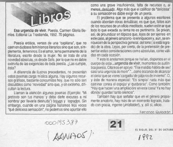 Esa urgencia de vivir [artículo] Fernando Quilodrán.