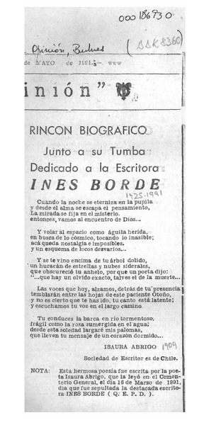 Junto a su tumba dedicado a la escritora Inés Borde [artículo] Isaura Abrigo.