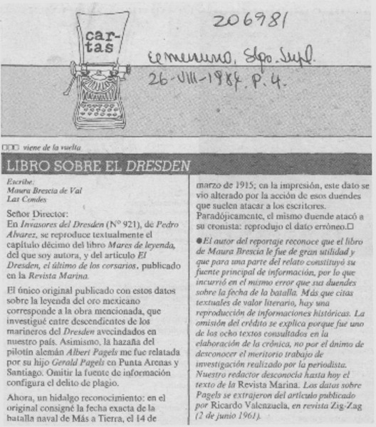 Libro sobre el Dresden [artículo]. Maura Brescia de Val