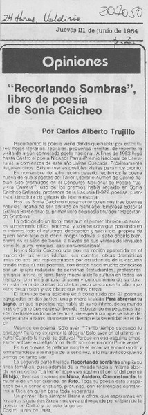 "Recortando sombras", libro de poesía de Sonia Caicheo [artículo] Carlos Alberto Trujillo.