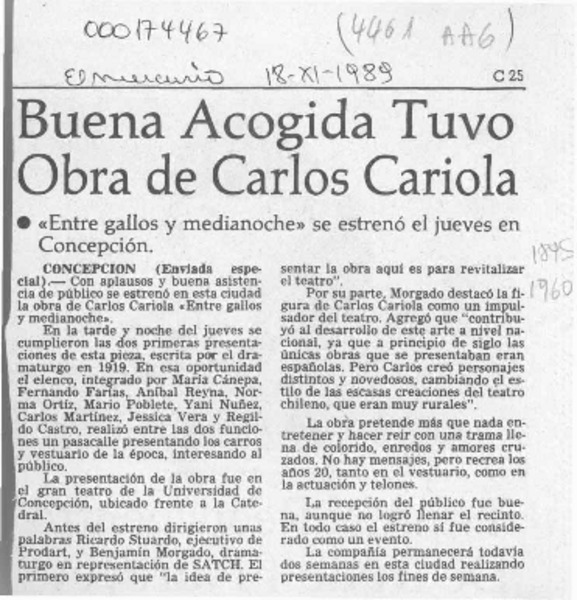Buena acogida tuvo obra de Carlos Cariola [artículo].