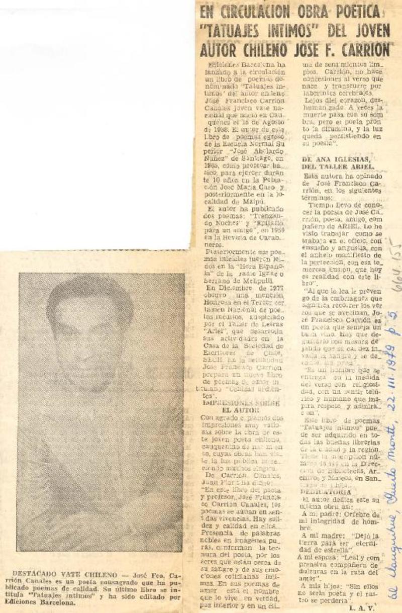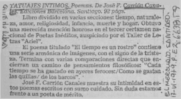 En circulación obra poetica "Tatuajes íntimos" del joven autor chileno José F. Carrión [artículo] L.A.V.