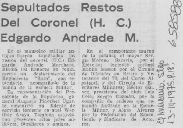 Sepultados restos del Coronel (H. C.) Edgardo Andrade M. [artículo]
