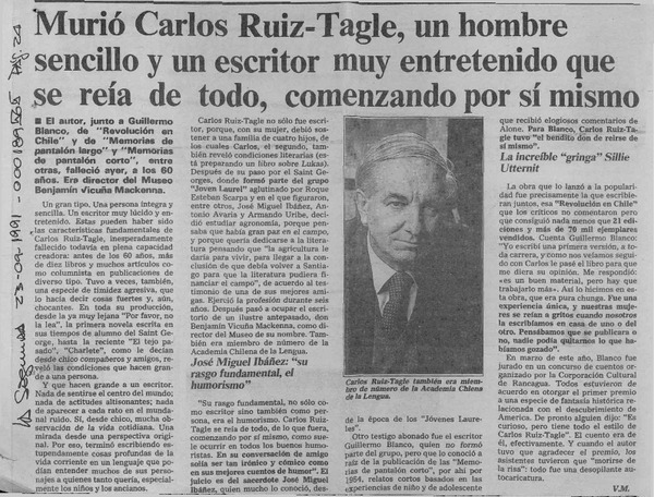 Murió Carlos Ruiz-Tagle, un hombre sencillo y un escritor muy entretenido que se reía de todo, comenzando por sí mismo [artículo] V. M.