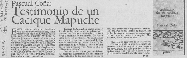 "Testimonio de un cacique mapuche" [artículo] V. M.