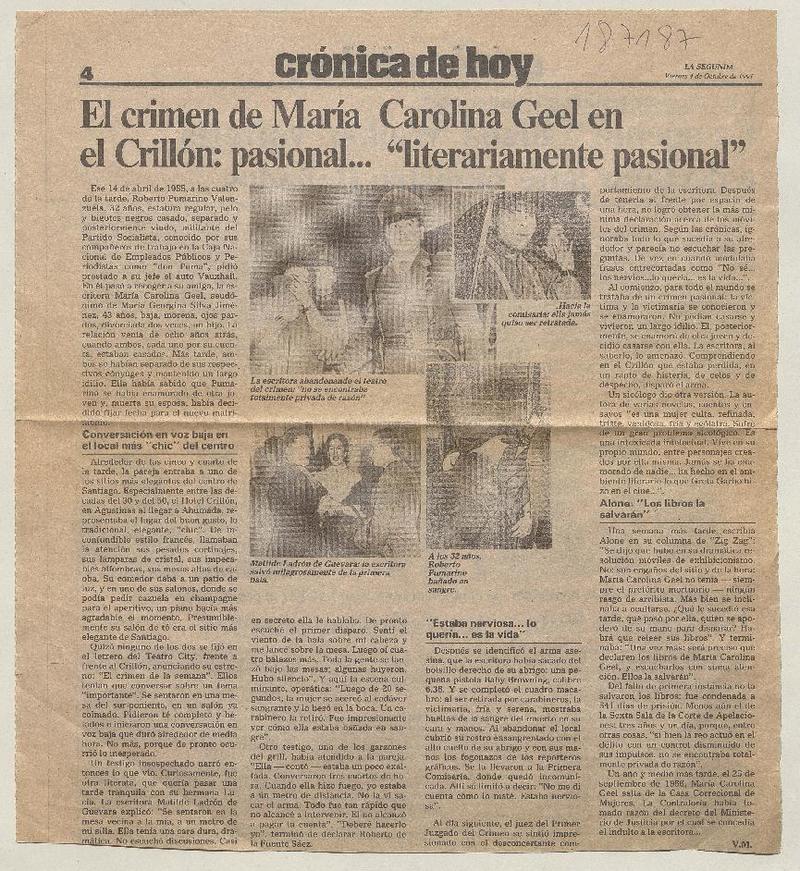 El crímen de María Carolina Geel en el Crillón, pasional "literalmente pasional" [artículo] V. M.