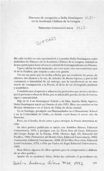 Discurso de recepción a Delia Domínguez en la Academia Chilena de la Lengua [artículo] Fernando González Urízar.