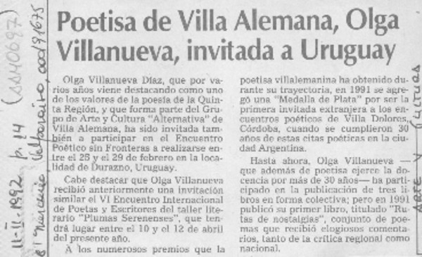 Poetisa de Villa Alemana, Olga Villanueva, invitada a Uruguay [artículo].