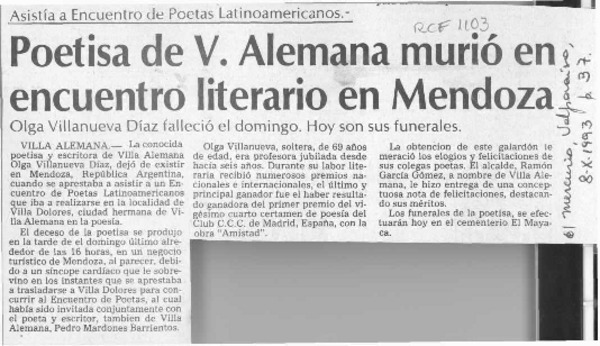 Poetisa de V. Alemana murió en encuentro literario en Mendoza [artículo].