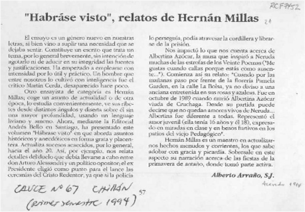 "Habráse visto", relatos de Hernán Millas [artículo] Alberto Arraño.