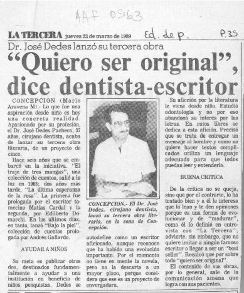 "Quiero ser original" dice dentista-escritor [artículo] Mario Aravena M.