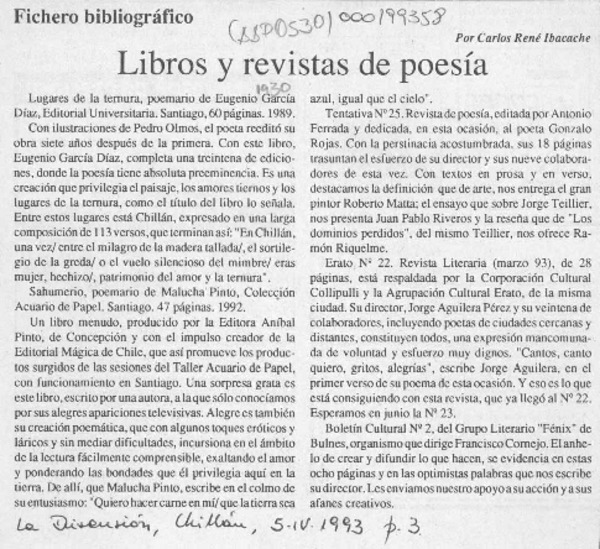 Libros y revistas de poesía [artículo] Carlos René Ibacache.