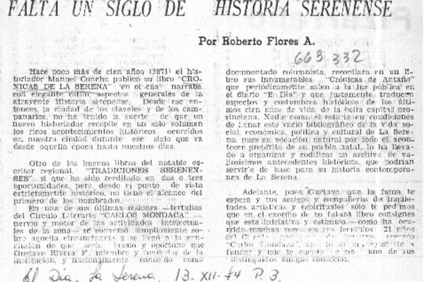 Falta un siglo de historia serenense [artículo] Roberto Flores A.