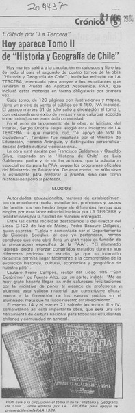 Hoy aparece tomo II de "Historia y geografía de Chile" [artículo].