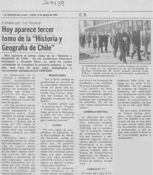 Hoy aparece tercer tomo de la "Historia y geografía de Chile" [artículo].