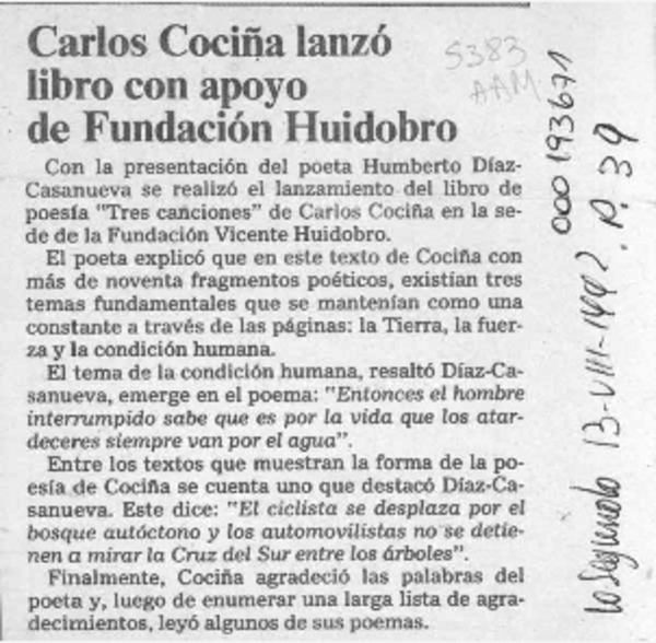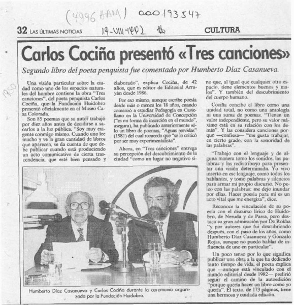 Carlos Cociña presentó "Tres canciones" [artículo].