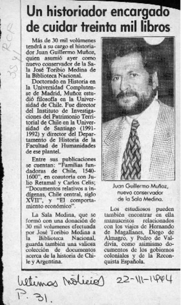 Juan Guillermo Muñoz, nuevo conservador de la sala Medina [artículo]