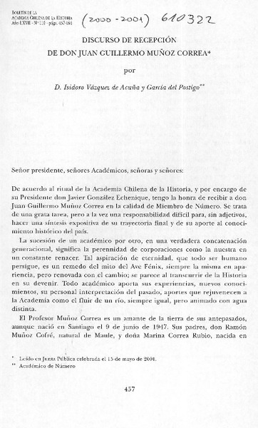 Discurso de recepción de don Juan Guillermo Muñoz Correa [artículo] Isidoro Vasquez de Acuña