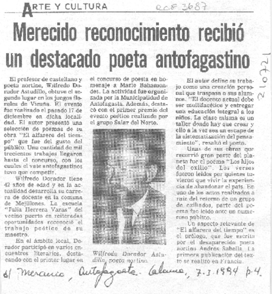 Premian a profesor y poeta de Antofagasta en Vicuña [artículo].