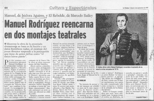 Manuel Rodríguez reencarna en dos montajes teatrales [artículo] Leopoldo Pulgar I.