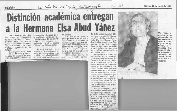 Distinción académica entregan a la Hermana Elsa Abud Yáñez [artículo].