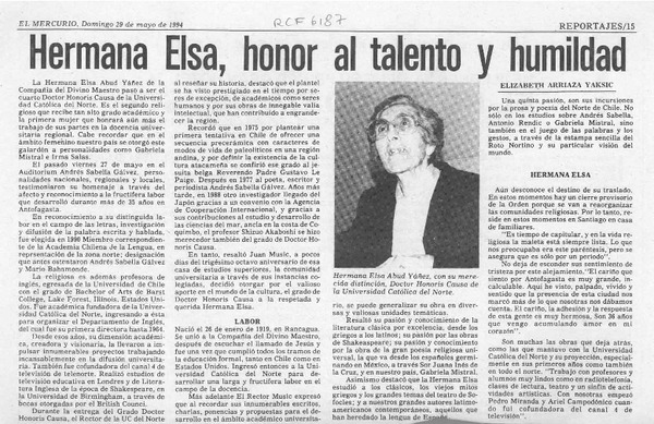Hermana Elsa, honor al talento y la humildad [artículo] Elizabeth Arriaza Yaksic.