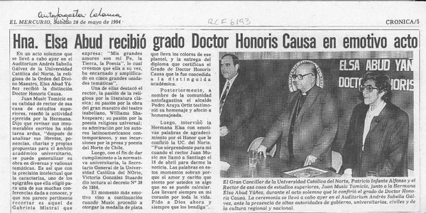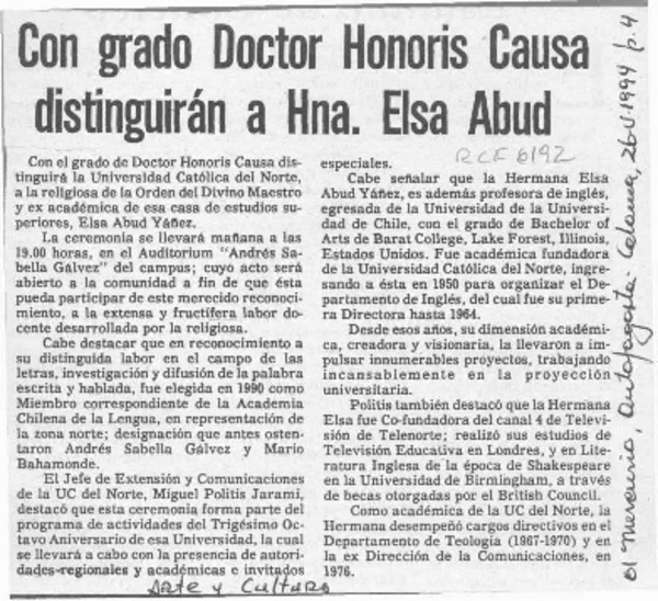 Con grado Doctor Honoris Causa distinguirán a Hna. Elsa Abud [artículo].
