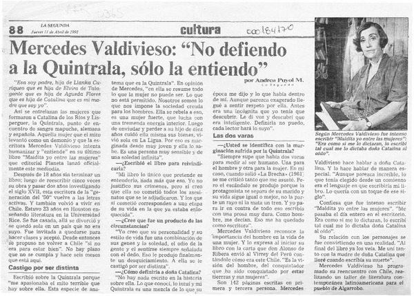 Mercedes Valdivieso, "No defiendo a la Quintrala, sólo la entiendo" [artículo] Andrea Puyol M.