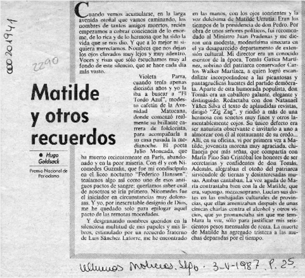 Matilde y otros recuerdos [artículo] Hugo Goldsack.