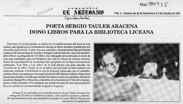 Poeta Sergio Tauler Aracena donó libros para la biblioteca liceana [artículo].
