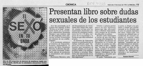 Presentan libro sobre dudas sexuales de los estudiantes [artículo] Susana Docmac.