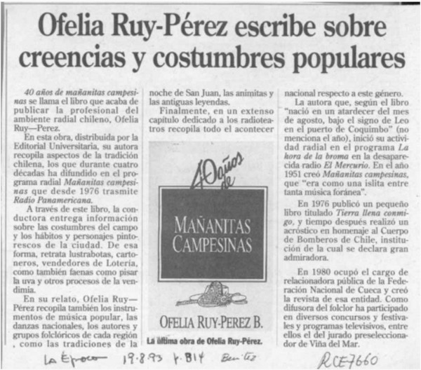 Ofelia Ruy-Pérez escribe sobre creencias y costumbres populares [artículo].
