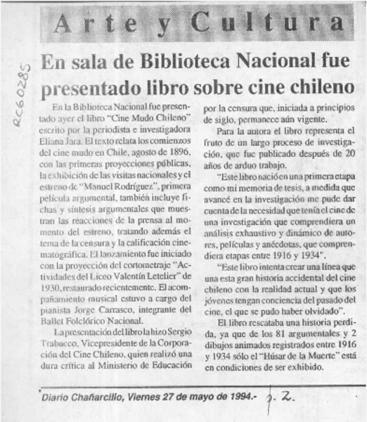Cine mudo chileno, ensayo de Eliana Jara [artículo] José Vargas Badilla.
