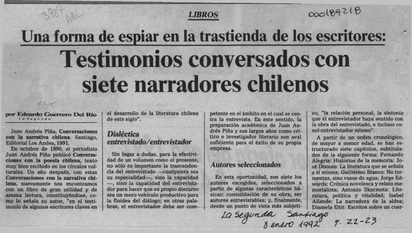 Testimonios conversados con siete narradores chilenos [artículo] Eduardo Guerrero del Río.