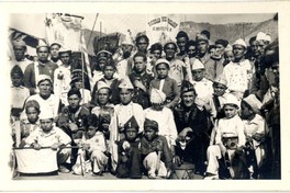Grupo de niños y adultos son retratados con indumentaria de chinos, instrumentos musicales y estandarte donde se lee "Sociedad del Rosario de Andacollo".