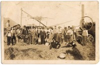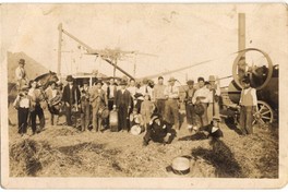 Niños músicos que sostienen instrumentos musicales de viento y percusión, son retratados junto a hombres adultos en pajar de zona rural. Aparece en la fotografía además, parte de una locomotora y al otro extremo, un niño montado a caballo.