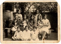 Fotografía de un grupo de once (11) niñas adolescentes en el jardín de una casa de madera; dos de ellas sostienen muñecos en sus brazos.