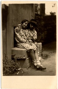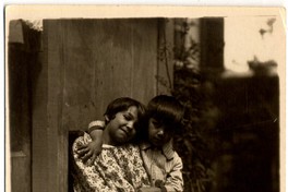 [Un niño y una niña [hermanos] sentados y abrazados en un jardín] [fotografía]. [Chile] : [entre 1920 y 1930]. 1 fotografía : monocromo, gelatina sobre papel fibra ; 14 x 9 cm. .